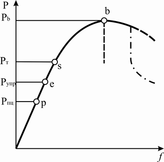 Испытания на изгиб можно проводить на любой универсальной испытательной машине, используемой для испытаний на растяжение. Образец устанавливают на опорную плиту в нижнем захвате и деформируют изгибающим ножом, крепящимся в верхнем захвате машины. Для уменьшения трения опоры, на которых лежит образец, часто делают из роликоподшипников. Образец изгибается при опускании верхнего или подъеме нижнего захвата. При этом на диаграммной ленте может быть записана диаграмма изгиба в координатах нагрузка Р – стрела прогиба f. Для пластичного материала диаграмма изгиба выглядит так, как показано на рис. 2.56. Если материал мало пластичен, то кривая обрывается в точке b. Знание величины нагрузок Pnu, P упр, P т, Pb позволяет определять пределы пропорциональности, упругости, текучести и прочности при изгибе. Напряжения на стадии упругой деформации рассчитывают по обычным формулам сопротивления материалов.