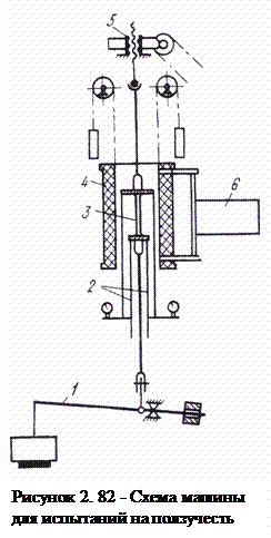 На рис. 2.82 показана принципиальная схема машины для испытаний на ползучесть. Нагружение образца 3 производится рычажной системой 1, соединенной с нижним захватом. Верхний захват связан с механизмом 5, обеспечивающим перемещение образца вдоль вертикальной оси печи.