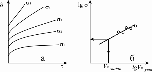 Рисунок 2. 83 - Схема определения предела ползучести: а – кривые ползучести при разных напряжениях; б – зависимость скорости установившейся ползучести от напряжения