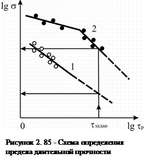 Иногда зависимость lg σ – lg τр имеет точку перелома (см. рис. 2.85, кривая 2). Она соответствует переходу от внутрикристаллитного или смешанного разрушения к полностью межкристаллитному разрушению при низких напряжениях. В таких случаях экстраполяцию можно проводить, если надежно установлен наклон прямой в области межкристаллитного разрушения.