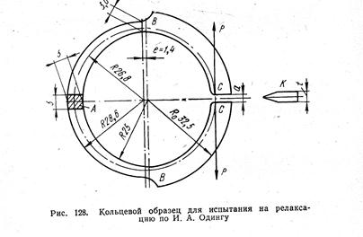 Широкое распространение получил метод И. А. Одинга, в котором релаксация оценивается на кольцевых образцах, расчетная часть которых ВАВ (рис. 128) имеет равное сопротивление изгибу. Напряжение в образце создается установкой клина К в прорезь СС. Утолщенные части образца ВС и ВС в релаксации участия не принимают. Они только передают усилие от клина к расчетной части кольца.