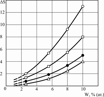 где σспл и σNb – напряжения, при которых в сплаве и чистом ниобии v п.уст.= 10-5 с-1. Видно, что Δ S растет с повышением легированности твердого раствора и гомологической температуры.