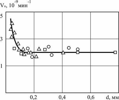 При высокотемпературной дислокационной ползучести p = 0 и v n, следовательно, не зависит от d. Если же деформация идет в результате диффузионной ползучести, то p = 2÷3 и v n существенно повышается при уменьшении d.