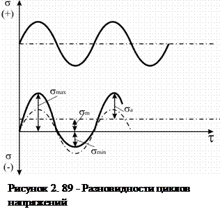 Во время любого усталостного испытания на образец действуют циклические напряжения, непрерывно изменяющиеся во времени и часто по знаку. Типичные примеры используемых циклических напряжений показаны на рис. 2.89. Цикл напряжений – это совокупность переменных значений напряжений за один период их изменения. Каждый цикл характеризуется несколькими параметрами. За максимальное напряжение цикла σmax принимают наибольшее по алгебраической величине напряжение. Минимальное напряжение цикла – σmin – наименьшее по алгебраической величине напряжение.