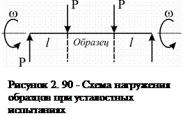 Наиболее распространенные схемы нагружения при усталостных испытаниях – изгиб и растяжение – сжатие. Схема изгиба реализуется по-разному. Особенно проста и чаще всего применяется схема чистого изгиба образца при вращении (см. рис. 2.90). Нагрузка здесь прилагается в двух точках, что обеспечивает постоянство изгибающего момента на всей рабочей длине образца.