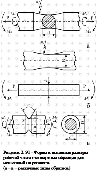Схемы некоторых стандартных образцов, используемых при усталостных испытаниях, показаны на рис. 2.91. Их рабочая часть имеет круглое или прямоугольное сечение. Используют гладкие (без надрезов) и образцы с концентраторами напряжений.