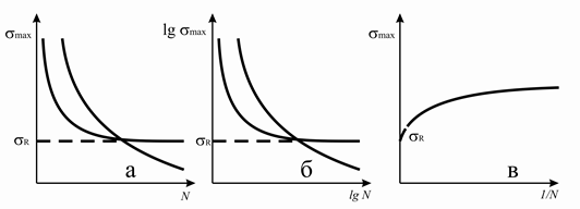 По мере уменьшения максимального напряжения цикла циклическая долговечность всех материалов возрастает. При этом у сталей и некоторых цветных сплавов, склонных к динамическому деформационному старению, кривая усталости асимптотически приближается к прямой, параллельной оси абсцисс (см.рис. 2.92, а, кривая 1). Ордината, соответствующая постоянному значению σmax, и есть предел усталости таких материалов σ R – наибольшее напряжение, которое не вызывает разрушения при любом числе циклов N (его иногда называют физическим пределом выносливости). Наиболее просто определяется σ R при использовании логарифмического масштаба (см.рис. 2.92, б). Удобно оценивать σ R и по кривым в координатах σmax – 1/ N (см.рис. 2.92, в). Здесь предел усталости определяют, экстраполируя кривую в точку ее пересечения с осью ординат, где 1/ N = 0. Этот способ особенно целесообразен для приближенной оценки σ R по результатам испытания небольшого числа образцов.