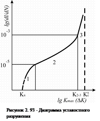 Все большее развитие в последние годы получают испытания на МЦУ, базирующиеся на концепциях механики разрушения. Эти испытания получили название испытаний на циклическую трещиностойкость. Их основным результатом является построение диаграммы усталостного разрушения – зависимости СРТУ от наибольшего значения K max или размаха Δ K коэффициента интенсивности напряжений цикла (рис. 2.93). При этом