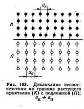 2. Другая причина зарождения дислокаций в период кристаллизации — возникновение напряжений. Когда происходит ориентированное нарастание (эпитаксия) кристалла на подложку, то сопряжение двух решеток из-за имеющегося всегда небольшого их несоответствия вызывает упругие напряжения в подложке и эпитаксиальном слое. Когда толщина эпитаксиального слоя достигает некоторой критической величины, компенсация несоответствия решеток подложки и растущего кристалла становится энергетически более выгодной не только в результате упругой деформации по всей поверхности сопряжения двух решеток, а частично за счет дислокаций, возникающих на этой поверхности (рис. 103). Такие дислокации называют структурными, эпитаксиальными или дислокационными несоответствиями.