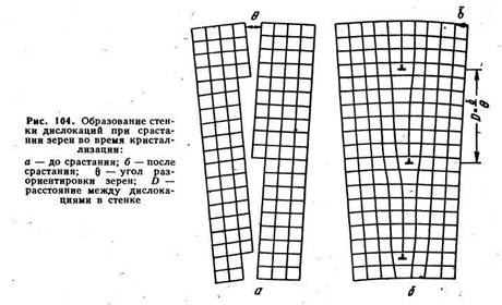 4. Дислокаций могут возникать во время кристаллизации из-за разных случайностей при росте кристаллов. Эти случайности приводят к образованию мозаичной структуры — кристалл состоит из субзерен (блоков), слегка взаимно разориентированных. Одна из возможных причин образования субзерен — изгиб очень «нежных» ветвей дендрита из-за конвекционных токов, градиента температур и действия других факторов. Когда слегка разориентированные ветви одного дендрита срастаются, на границе между ними возникают дислокации. На рис. 104 показан простейший случай срастания двух симметрично разориентированных частей одного кристалла (или разных кристаллов). Вертикальные атомные плоскости в месте срастания не доходят до низа кристалла. Вокруг края каждой такой плоскости находится краевая дислокация. На рис. 104, б поверхность срастания представляет собой стенку из положительных дислокаций.