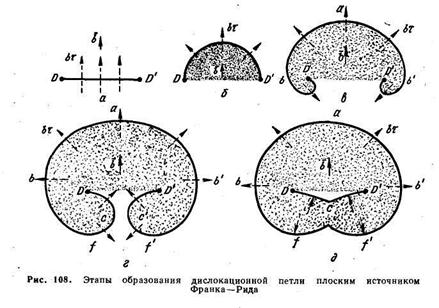 Дислокация DCD’, выпрямляясь под действием приложенного напряжения и линейного натяжения, сокращает свою длину до DD’, т. е. приходит в стартовое положение исходной дислокации. После этого, если продолжают действовать напряжения не меньше τкр, новая дислокация уже рассмотренным путем дает новую дислокационную петлю и дислокацию DD’ и т. д. Таким способом источник Франка — Рида может генерировать неограниченное число петель дислокаций в одной плоскости скольжения и создавать в этой плоскости значительный сдвиг.