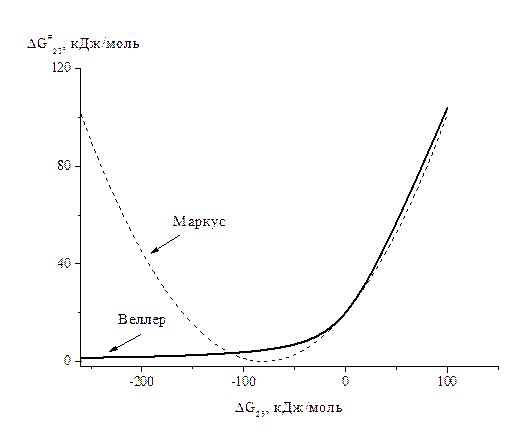 Зависимости DG#23 от DG23 по Маркусу и Веллеру практически совпадают при DG23 > 0 и сильно различаются при - DG23 < 4 DG#23(0) (инвертированная область Маркуса).