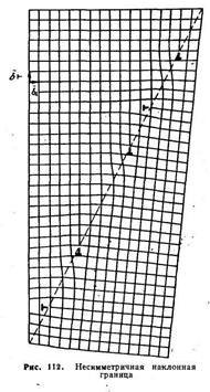 Если малоугловая граница лежит несимметрично, то строение ее усложняется, так как на ней оканчиваются две группы плоскостей, образующие две серии краевых дислокаций (рис. 112).