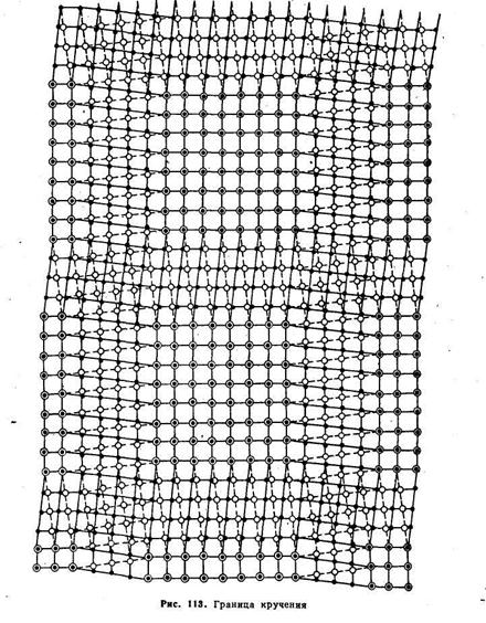 Малоугловая граница кручения образована рядом винтовых дислокаций (на рис. 113 черные кружки обозначают атомы ниже плоскости границы, а светлые — выше ее).