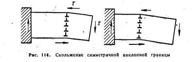 Симметричная наклонная граница, являющаяся стенкой краевых дислокаций одного знака с параллельными векторами Бюргерса и параллельными плоскостями скольжения, может легко перемещаться при коллективном скольжении всех дислокаций, входящих в стенку (рис. 114). Такую границу называют скользящей.