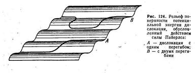 Теория предсказывает, что в кристалле, свободном от других дефектов, дислокация может скользить и при напряжениях меньше напряжения Пайерлса. Благодаря действию сил Пайерлса потенциальная энергия дислокаций является периодической функцией ее положения в решетке (рис. 124). Минимальные значения потенциальной энергии (канавки потенциального рельефа) соответствуют положениям дислокации вдоль направлений плотнейшей упаковки. Для перемещения дислокации из одной канавки в соседнюю требуется преодолеть потенциальный барьер, приложив напряжение Пайерлса.