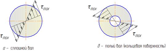 Максимальные касательные напряжения кручения возникают у края сечения, а к центру – убывают до нуля. Поэтому в большей степени сопротивляются кручению те части бруса, которые расположены ближе к его поверхности.