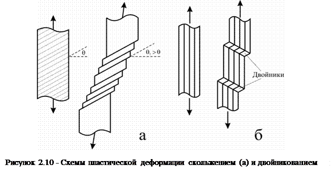 механизмом пластической деформации. Движение дислокаций может вызывать макропластическую деформацию образца путем скольжения либо двойникования. Конечным итогом такого движения является сдвиг одних отдельных частей кристалла относительно других (рис. 2.10а) или сдвиг и поворот атомных рядов в отдельных участках образца плод некоторым углом к направлению сдвига (рис. 2.10б).