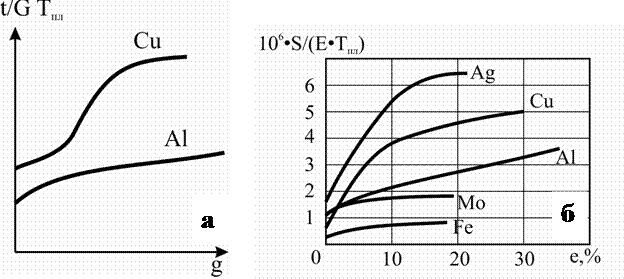 Для получения сопоставимых данных, отражающих влияние особенностей движения по-разному расщепленных дислокаций, кривые построены при одной гомологической температуре в координатах t/G-g для монокристаллов с одной ориентировкой (см. рис. 2.23,а) и S/E-e для поликристаллов (см. рис. 2.23.б). Отношение (t/G)/(S/E) при сравнении деформационного упрочнения разных металлов необходимо потому, что напряжение течения прямо пропорционально модулю на всех стадиях деформации. Следовательно, при прочих равных условиях, коэффициент деформационного упрочнения сравниваемых металлов также пропорционален их модулям. Чтобы исключить различия в кривых деформационного упрочнения, обусловленные разницей в модулях упругости, мы и откладываем по оси ординат на рис. 2.23 отношения t/G и S/E.