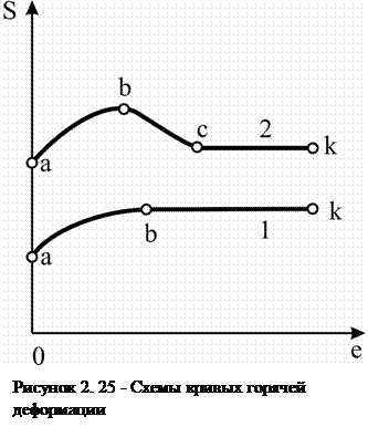 Горячая деформация имеет много общего с теплой, но принципиально отличается от нее полнотой термического возврата в определенном диапазоне степеней деформации. Поэтому стадийность горячей деформации качественно иная, чем при теплой и тем более холодной деформации. На рис. 2.25 схематично показаны два возможных типа кривых горячей деформации (качественно они являются общими для моно- и поликристаллов).