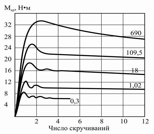 Рисунок 2. 26 - Кривые кручения при 100 0С стали с 0,25% С (Россар). Цифры у кривых - число скручиваний в минуту.