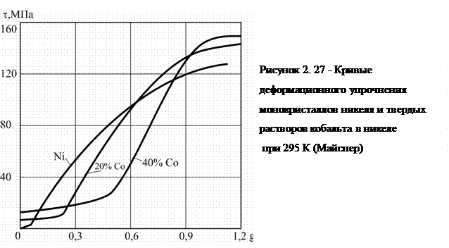 Отличия деформационного упрочнения концентрированных твердых растворов от чистых металлов при низких температурах наиболее полно можно выявить, сопоставив соответствующие кривые монокристаллов, благоприятно ориентированных для одиночного скольжения. На рис. 2.27 такое сопоставление сделано на примере никеля и его сплавов – твердых растворов с кобальтом. В целом характер кривых не меняется, что свидетельствует об идентичности процессов, определяющих упрочнение чистых металлов и твердых растворов. В то же время видно, что растворение легирующего элемента вызывает прогрессирующие: 1) повышение критического напряжения сдвига; 2) удлинение стадии легкого скольжения; 3) повышение напряжений перехода ко II и особенно III стадиям; 4) увеличение коэффициента деформационного упрочнения на III стадии.