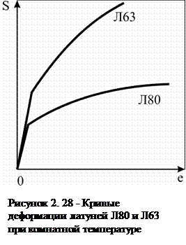 Знание изложенных в этой главе закономерностей формирования дислокационной структуры при пластической деформации и идущего при этом деформационного упрочнения позволяет интерпретировать, сопоставлять и приближенно прогнозировать вид кривых деформаций и структуру конкретных металлов и сплавов в заданных условиях деформации. Например, нас интересует, как будут выглядеть при комнатной температуре кривые растяжения отожженных латуней Л80 и Л63. Мы можем легко установить, что комнатная температура (20°С) для этих сплавов соответствует 0,23 и 0,25 по гомологической шкале (температура плавления латуни Л80 - 980°С, Л63 - 902°С). Следовательно, деформация обеих латуней будет идти при температурах в области границы между холодной и горячей деформацией. Латунь Л80 – однофазная, ее структура состоит из кристаллов твердого раствора на основе меди с ~20% цинка. В Л63, помимо более легированного (30-35 % в соответствии с диаграммой состояния Cu-Zn) медного раствора, будут присутствовать кристаллы β-фазы (CuZn). Это приведет к повышению уровня напряжений течения, увеличению коэффициента деформационного упрочнения и снижению деформационной способности двухфазной латуни Л63 по сравнению с однофазной Л80. В результате кривые растяжения их поликристаллов схематично будут выглядеть как на рис. 2.28.