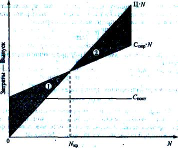Вследствие наличия постоянных затрат производство продукции до определенного критического объема (Nкр) является убыточным — заштрихованная площадь 1.