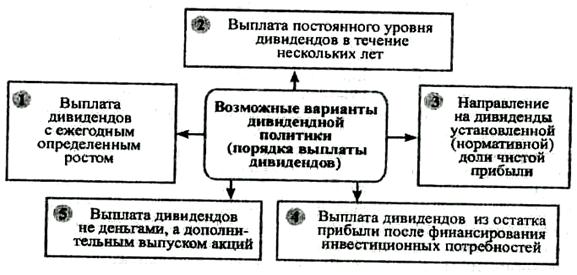 Понятно, что низкие дивиденды приводят к противоположным результатам. С учетом этих обстоятельств акционерное общество (предприятие) вынуждено выбрать такую дивидендную политику, которая соответствовала бы конкретным условиям его деятельности. Возможные варианты дивидендной политики (порядок выплаты дивидендов) на том или ином предприятии представлены на рис.10.2.