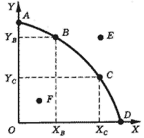 По оси абсцисс будем откладывать количество предметов потребления (X), по оси ординат - количество средств производства (Y). Кривая АВСD, называемая границей производственных возможностей, характеризует максимально возможные объемы производства средств производства и предметов потребления при полном использовании всех имеющихся ресурсов.