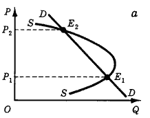 На рис. 6,а линия спроса имеет нормальный вид (т.е. характерный отрицательный наклон). В то же время линия предложения меняет знак наклона при росте цены, что приводит к существованию двух положений равновесия - в точках Е1 и Е2.