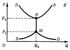 На рис. 6,б представлен случай, когда линии спроса и предложения совпадают на отрезке NM. Равновесие на рынке достигается при любой цене в диапазоне от P1 до P2 и равновесном объеме QE. Изменение цены в указанном диапазоне недостаточно чувствительно, чтобы вызвать у потребителей изменение объема спроса, а у производителей - изменение объема предложения. Этот случай имеет физическую аналогию в виде равновесия шара на горизонтальной площадке: равновесие возможно в любой точке этой площадки.