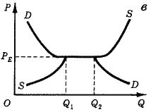 На рис. 6,в линии спроса и предложения также имеют общий отрезок: в этом случае равновесие устанавливается при любом объеме в интервале от Q1 до Q2 и равновесной цене РЕ. Изменение объема в этом интервале не вызывает изменения цены спроса и равной ей цене предложения.