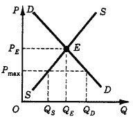 PE - цена равновесия, которая установилась бы на рынке без вмешательства государства. Если вводится максимальная цена Рmax, которая меньше цены равновесия, то при этой цене производители предлагают на рынке QS единиц товара, а покупатели предлагают QD единиц. Причем QD > QS. Таким образом, товар становится дефицитным.