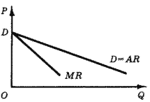 2. Фирма в условиях чистой монополии. В этом случае цена не является заданной величиной. Производитель, сталкивающийся с совокупным рыночным спросом, осознает, что чем больше продукции он произведет, тем меньшей будет возможная цена реализации. Кривая спроса (и средней выручки) для монополиста имеет отрицательный наклон (рис. 6).