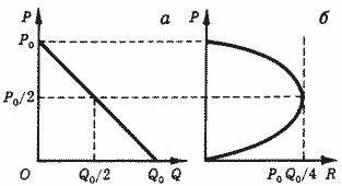 Эта функция имеет постоянную производную, но ее эластичность изменяется во всем диапазоне возможных значений: когда цена стремится к нулю, эластичность также стремится к нулю, по мере приближения к цене P0 эластичность стремится к бесконечности. В середине этого интервала, т. е. при Р =P0 / 2, выполняется равенство η = 1 (см. МП, II, упражнение 1), и суммарные расходы принимают наибольшее значение. На рис. 2,б представлен график функции суммарных расходов R(P) и показано положение максимума.