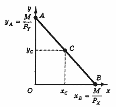 Поскольку величины М, РX и РY, по нашему предположению, постоянны, уравнение (4) представляет собой уравнение прямой линии (типа y = ax + b), где М/РY — свободный член, а –РX/РY — коэффициент при переменной х. Бюджетная линия соответственно представляет собой прямую линию типа линии АВ, изображенной на рис. 1.
