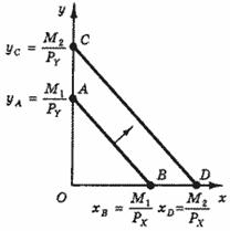 Предположим теперь, что доход потребителя увеличился с М1 до а цены товаров остались неизменными. Тогда уравнение новой бюджетной линии имеет вид: