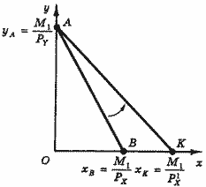 Если первоначальная бюджетная линия пересекает ось х в точке В с абсциссой xB = М1/PY, то “новая” бюджетная линия (при цене PX1 < PX пересекает ось х в точке K с абсциссой xk = М1/PX1.