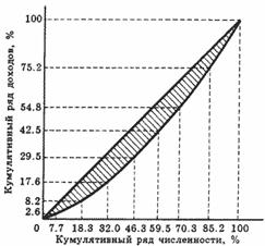 Чтобы понять, каким образом эта кривая отражает неравенство доходов, попытаемся ответить на вопрос: какой бы вид имела кривая Лоренца в случае полного равенства доходов? Очевидно, что в такой ситуации каждый получал бы 2500 руб. дохода, т. е. ордината точки А переместилась бы в точку Е, точки B — в точку F и т. д., следовательно, мы получили бы прямую OD, составляющую с осями координат угол в 45о. Таким образом, неравенство доходов характеризуется степенью отклонения кривой Лоренца от биссектрисы 1-го координатного угла. Это отклонение можно измерить через отношение площади заштрихованной фигуры между кривой Лоренца и прямой OD к площади всего треугольника ODK. В результате получим показатель, который в литературе называется коэффициентом концентрации (или коэффициентом Джини (по имени итальянского статистика и экономиста К. Джини)):