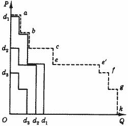 На рис. 7 ступенчатая линия abcefgkim представляет рыночную кривую спроса, полученную суммированием по горизонтали четырех частных кривых спроса dd, а огибающая плавная кривая DD — кривую спроса при достаточно большом числе покупателей.