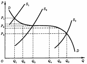 При этом ясно, что равновесная цена, обеспечивающая сбалансированность рынка (отсутствие избытка спроса и избытка предложения) может существовать лишь при сравнительно небольшом или, наоборот, близком к насыщению объеме предложения. Так, если кривая предложения S1, рынок может быть сбалансирован при цене Р1, если кривая предложения S2, рынок может быть сбалансирован при цене Р2. Но если кривая предложения займет положение S3, то рынок уже нельзя сбалансировать посредством “назначения” цены Р3, так как ординате Р3 на кривой спроса соответствует множество точек с абсциссами от Q3 до Q4.