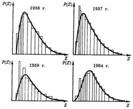 В его распоряжении имелись гистограммы распределения заработной платы за 1956, 1957, 1959 и 1964 гг. (Швырков В. В., Аидина Л. К. Модель распределения населения по доходам // Опыт применения математических методов и ЭВМ в экономико-математическом моделировании потребления. М., 1968) (рис. 10).