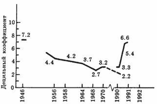 Ломаная линия, характеризующая изменение децильного коэффициента, образует на рисунке как бы профиль ямы уравнительного распределения с пологим, продолжительным спуском (1946—1968 гг., снижение децильного коэффициента в 2.5 раза), широким плоским дном стабилизации (в 1970—1990 гг. децильный коэффициент составлял 3.2—3.3) и крутым подъемом (в 1991 г. и I квартале 1992 г. он увеличился вдвое и приблизился вплотную к уровню 1946 г.). Что определяло столь необычную динамику децильного коэффициента?