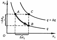 Предельная норма технической замены связана с предельными продуктами обоих ресурсов. Обратимся к рис. 8. Переход из точки А в точку В выполним за два шага. На первом шаге увеличим количество первого ресурса; при этом выпуск продукции несколько увеличится и мы перейдем с изокванты, соответствующей выпуску q, в точку С, лежащую на изокванте. Считая приращения малыми, можем приращение представить приближенным равенством: