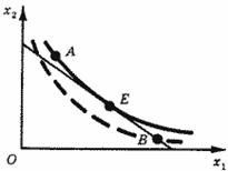Мы могли бы по-иному определить наилучшую комбинацию ресурсов. Фирма, производящая продукт в количестве q, заинтересована в выборе такого варианта производства, который позволил бы получить данный выход продукта при наименьших расходах на приобретение ресурсов. Задача сводится к отысканию на заданной изокванте такой точки, которая располагалась бы на самой низкой изокосте. И в этом случае искомая комбинация изображается точкой касания изокванты и изокосты (рис. 9,б), а для нее должно выполняться соотношение (7). В отличие от потребителя, доход которого предполагается заданным, для фирмы ни расходы на ресурсы, ни выпуск продукции не являются заданными величинами. И то и другое - результат согласованного выбора с учетом ситуации на рынке продукта. Однако, зная цены ресурсов, мы можем выделить экономически эффективные варианты производственного процесса. Будем называть вариант экономически эффективным, если фирма не может увеличить выпуск продукта без увеличения расходов на ресурсы и не может снизить расходов без сокращения выпуска. На рис. 10. точка Е соответствует эффективному, а точки А и В - неэффективным вариантам: вариант А дороже, чем Е, при том же выходе продукта; варианту В соответствуют те же затраты, что и варианту Е, но выход продукта здесь меньше. Пропорциональность предельных продуктов ценам ресурсов мы можем теперь трактовать как условие экономической эффективности производственного варианта.