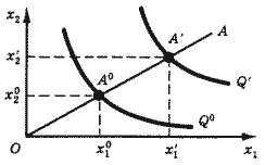 На карте изоквант пропорциональное изменение расхода ресурсов изображается движением вдоль луча, выходящего из начала координат (рис. 13).