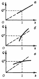Изокванты, пересекающие луч ОА в различных точках, показывают, как при продвижении вдоль луча изменяется объем выпуска продукта. Выбрав в качестве единицы длины расстояние от начала координат до исходной точки А0, можно построить график изменения объема выпуска в зависимости от масштабного коэффициента k. Рис. 14 иллюстрирует постоянную (а), возрастающую (б) и убывающую (в) отдачу от масштаба.