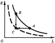 Ситуация была бы совершенно иной, если бы фирма, сохранив выпуск продукции, смогла бы уменьшить затраты труда без увеличения затрат капитала или, наоборот, смогла бы уменьшить затраты капитала без уменьшения затрат труда, т. е. смогла бы перейти из точки А или В в точку С, лежащую ниже и левее старой изокванты. В пределах исходных производственных возможностей такой переход не мог бы осуществиться: в точке С производственная функция принимала меньшее значение, чем на изокванте, проходящей через точки A и В. Значит, должна была измениться производственная функция. При этом изокванта, соответствующая исходному выпуску продукции, должна переместиться влево вниз и пройти через точку С.