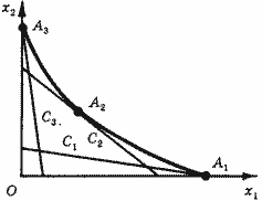 Появление нового вида ресурса само по себе еще не означает, что фирма будет его использовать. Если его цена будет слишком высока (изокоста С1 на рис. 19), то задача выбора ресурсов будет иметь угловое решение (точка А1) и фирма откажется от использования нового вида ресурса. При снижении цены фирма начнет его применять наряду с традиционным видом (изокоста С2 и точка А2). Если традиционный вид может быть полностью замещен новым и цена на новый вид ресурса достаточно низка, то задача выбора будет иметь противоположное угловое решение (изокоста С3 и точка А3) - традиционный вид ресурса будет полностью вытеснен новым.